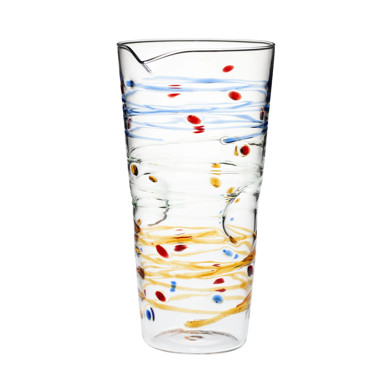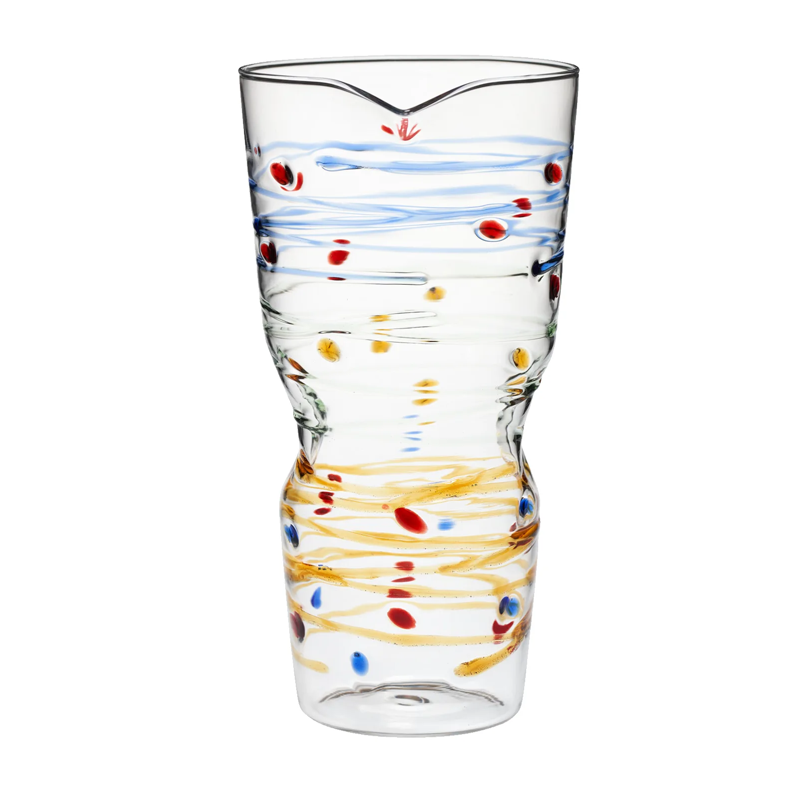 Brocca pinzata in vetro borosilicato con dettagli in pasta colore, soffiato a bocca. Tocchi di colore per portare allegria in tavola. Capacità 1,25 L