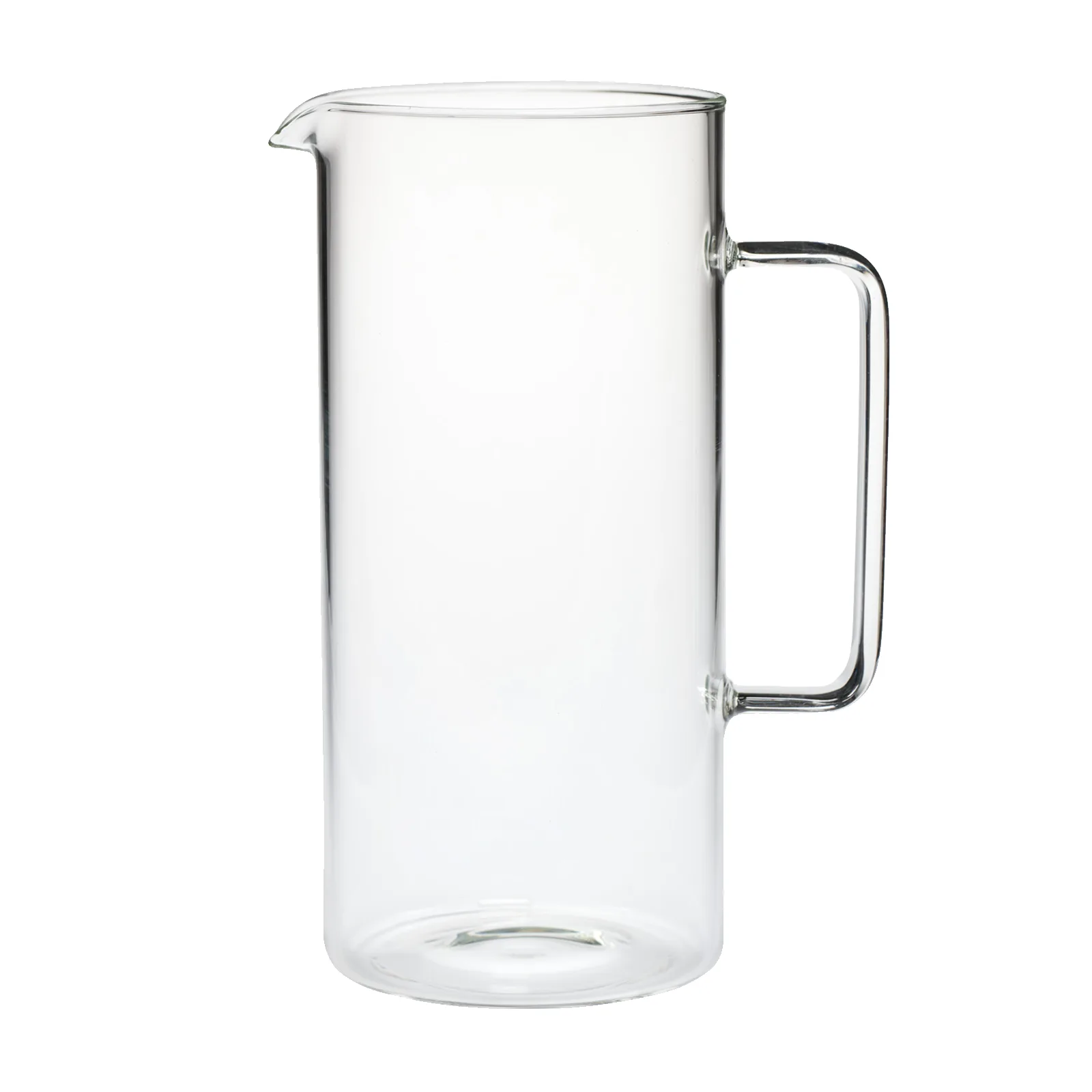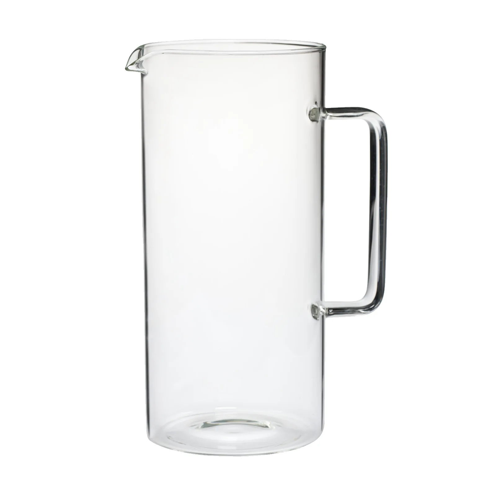 Brocca con manico in vetro borosilicato trasparente, soffiato a bocca. Linea pulita e moderna. Leggera, semplice e intramontabile. Adatta per contenere acqua e bevande fredde o calde. Capacità 1,25 L