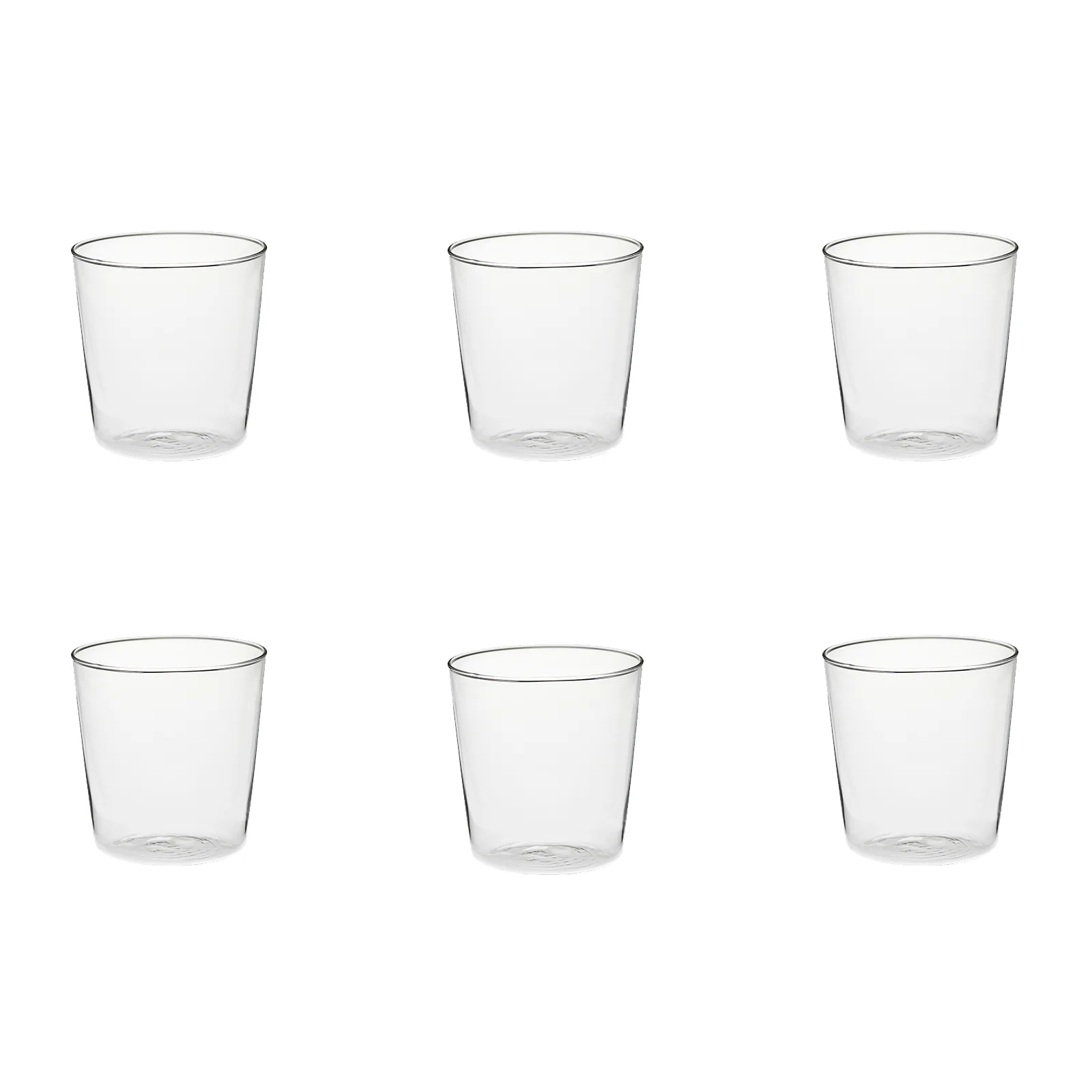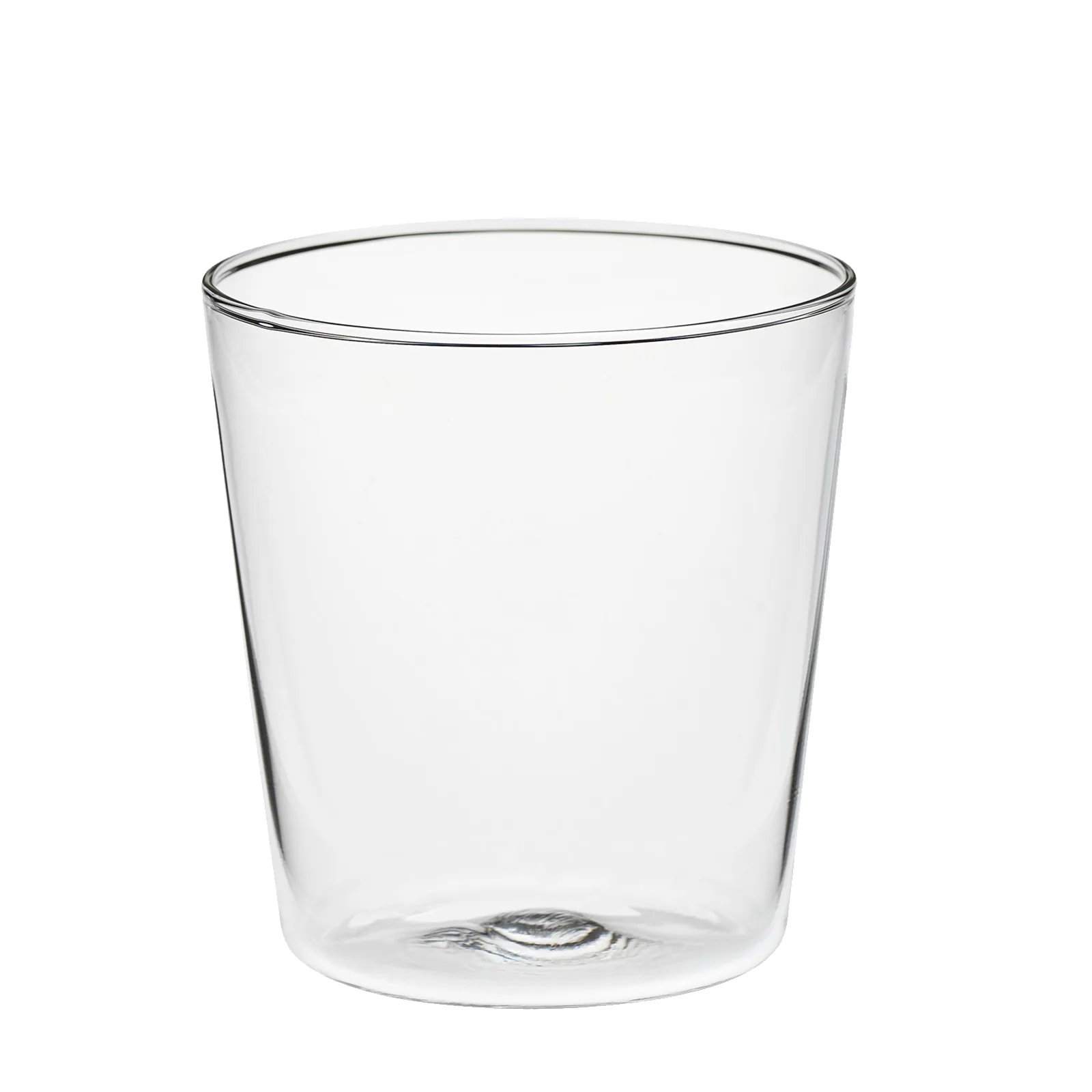 Bicchiere vino, senza stelo, in vetro borosilicato trasparente, soffiato a bocca. Linea pulita e moderna. Leggero, semplice e intramontabile. Capacità 300 ml. Set da 6 pezzi