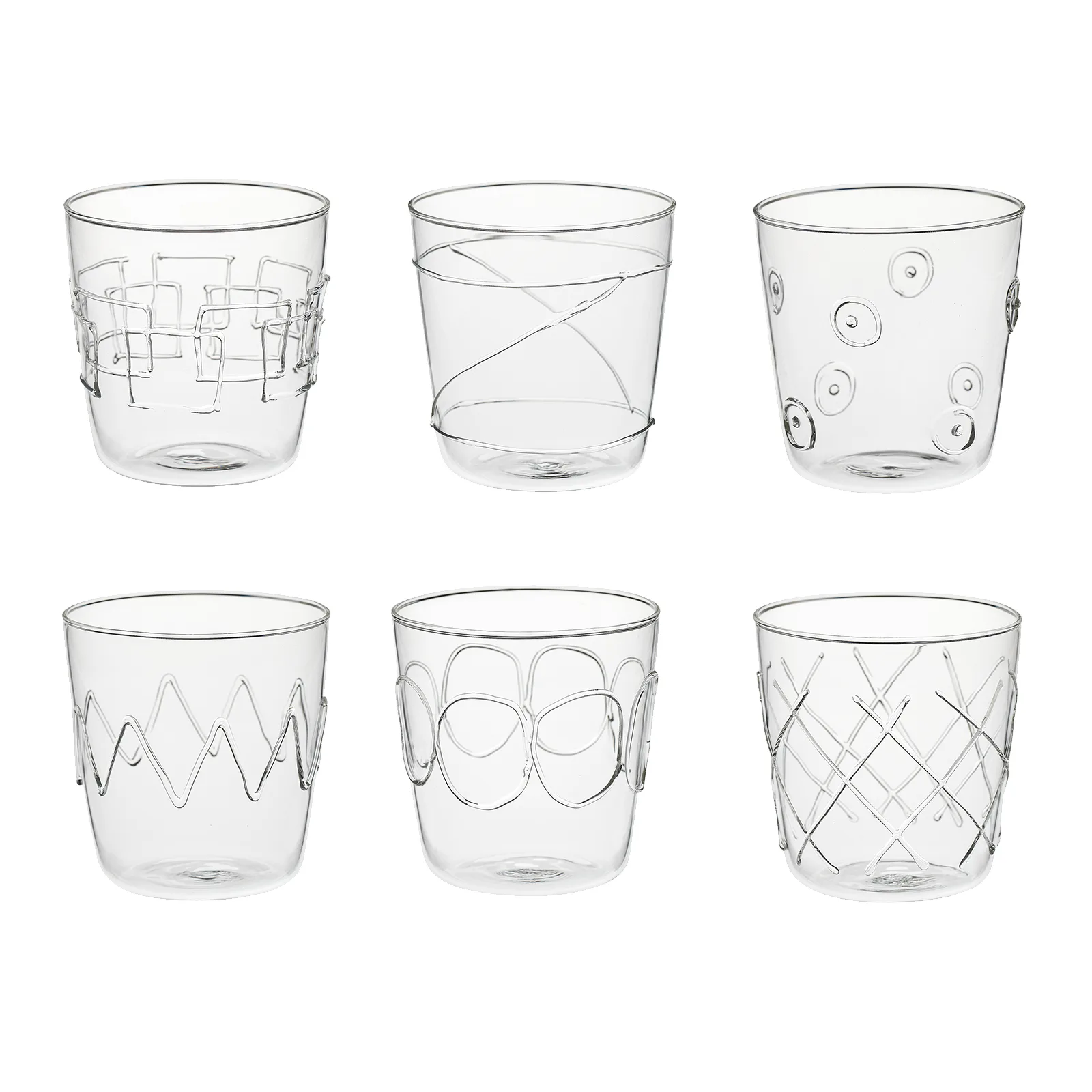 Tumbler in vetro borosilicato con applicazioni in vetro trasparente, soffiato a bocca. Forma pulita e moderna. Segni grafici in vetro trasparente a caratterizzare in modo diverso ogni bicchiere che compone il set. Capacità 390 ml. Confezione da 6 pezzi con decori assortiti.